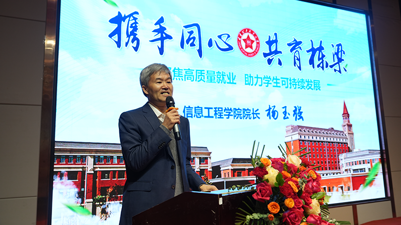 会议第一项议程,beat365在线唯一官网副校长、信息工程学院院长杨玉强教授以“聚焦高质量就业 助力学生可持续发展”为主题,深入分享了对职业教育的前沿见解与学院系统化人才培养规划。他明确指出:高等职业教育兼具岗位教育、技术教育与就业教育属性,职业本科作为高端技能人才培养的关键载体,已与普通本科教育构建起并行发展的现代教育体系。基于37年教育积淀,杨玉强教授提出“大学之大,在于有大师、明大德、传大道、担大责、育大爱”的育人理念,并从专业布局、师资梯队、实训平台与大学文化四个维度,向与会家长全景展示学院办学指导思想和办学实力。针对不同层次学生的发展需求,他重点解读了“2.5+0.5+1”(本科)、“2+0.5+0.5”(专科)、“1+0.5+0.5”(专升本)“能力三阶递进”特色鲜明的人才培养模式,实现学生校内学习与企业岗位需求的精准对接。同时,杨玉强教授还分享了近几年学院毕业生在高薪就业、考研升学、参军、考公考编等领域的典型案例,以真实数据和鲜活事例,让家长直观感受到学院的育人成效。在学生培养层面,学院坚持“就业导向+长远发展”双轮驱动,不仅关注学生毕业时的岗位适配能力培养,更着眼于其终身成长潜力与未来生活质量提升。通过将创新教育融入教学、搭建德智体美劳五育融合平台、实施“爱的教育”与“责任教育”等举措,让学生在温暖关怀中厚植家国情怀,在社会实践中锤炼责任担当。最后,杨玉强教授向家长们发出协同育人倡议,呼吁构建“家庭-学校-企业-社会”四方联动的育人共同体,凝聚教育合力,共同努力将学生培养成“品德高尚、技能高超、情趣高雅、就业高端”的新时代栋梁之才。