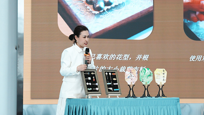 随后,黎婧老师围绕非遗文化、漆扇艺术与宋锦技艺展开详细介绍,生动讲解漆扇的灵动精妙、宋锦的华美端庄及其深厚文化底蕴,让在场教职工全面了解两项非遗的历史渊源、工艺特点与文化价值。