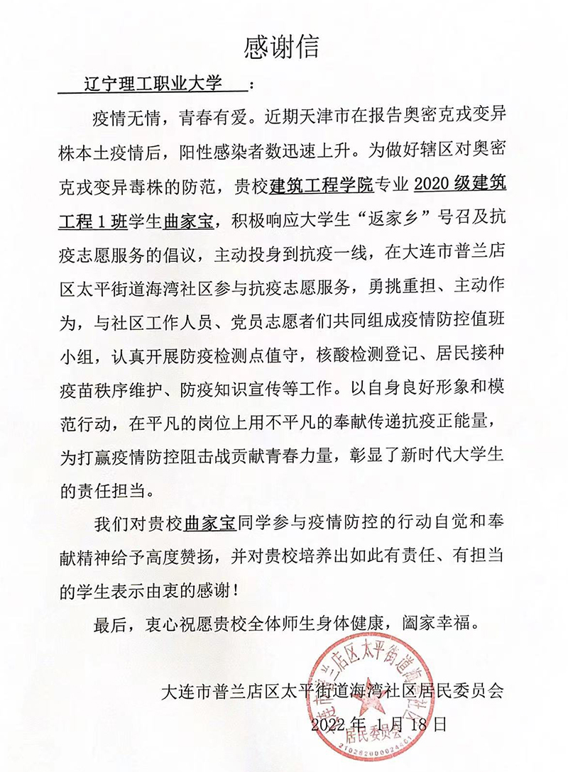 2020级工程造价一班的郑润泽在本轮新冠肺炎疫情防控的紧要关头积极响应共青团沈河区委号召,挺身而出,坚守“疫”线,为打赢这场没有硝烟的战争贡献青春力量。2020级工程造价一班朱致慧参加了沈阳市浑南区五三街道塞纳社区党委组织的返家乡社会实践活动。活动期间,他积极主动承担志愿服务,协助社区工作人员签到,引导社区党员入座,他参加了社区党委组织的党员大会,聆听了现场老师宣讲十九届六中全会精神,了解了中国共产党的光辉历程及取得的辉煌成绩。2020级建筑工程技术一班曲家宝参加了大连市普兰店区太平街道海湾社区的返家乡社会实践活动,曲家宝说:“志愿者们一直默默无闻地为群众服务,自己非常有幸作为其中一员,从2020年至今这是第三次穿上防护服,同时也希望这是最后一次。惟愿岁月如初,一切安好!”