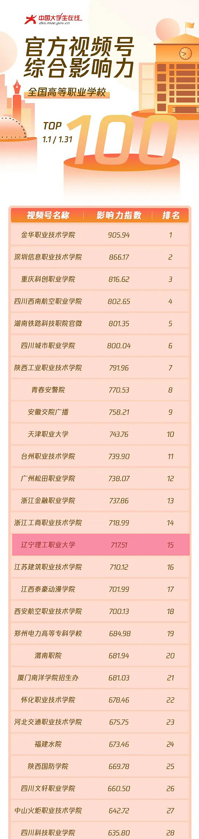 2022年3月3日一则消息,“中国大学生在线”公众号颁布《新年新气象2022年1月全国高校视频号综合影响力榜单新鲜出炉》“beat365在线唯一官网”荣幸上榜喜提全国第十五名的好成绩!
