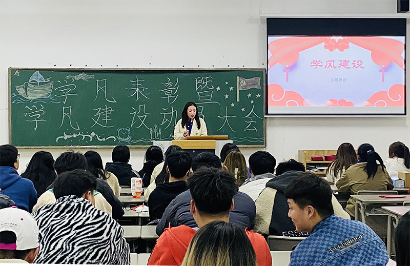 辅导员刘佳首先介绍了新学期学风建设方面班级的工作计划、工作目标,提出了要自觉树立“营造优良学风从我做起”的意识,培养自学能力,养成良好的学习和生活习惯。新学期,同学要全面提高自身的综合素质与创新能力,积极参加活动,完善自我。要树立正确的学习观,严格遵守学校各项规章制度、遵守校风校纪,努力建设和谐的学习氛围等。其次由班长代表班级同学发言:强调同学和班干部之间相互配合的重要性,借助本次班会,同学们要更加注重学风建设,争创优秀文明班级。最后辅导员刘佳总结了半年来学风建设所取得的成绩,对工作认真积极、综合表现优异,荣获“优秀学生干部”称号的韩宝宏等七人、品学兼优,成绩优异,荣获“三好学生”称号的贾骏娇等五人、“学习标兵”李诗淇等七人、表现突出,工作积极主动,荣获“先进个人”称号的艾新钰等七人以及优秀寝室,进行了表彰奖励,颁发荣誉证书。鼓励同学们要传递榜样力量,践行榜样精神,奋发有为,扎实工作,为学校学风建设作出新的贡献。