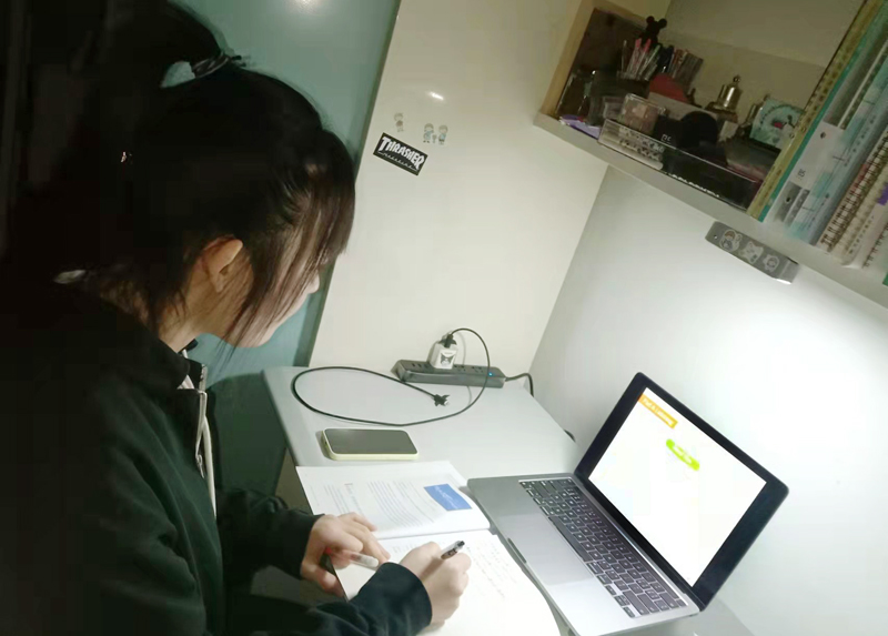 学生在寝室上网课