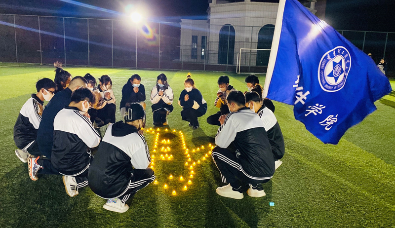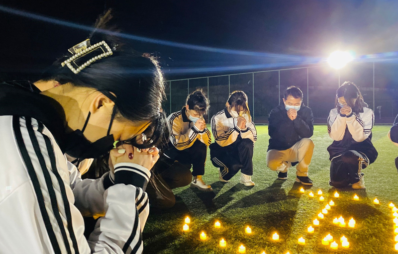 在悼念仪式的现场,气氛肃穆,辅导员老师和同学们带着悲痛的心情,用电子蜡烛摆出飞机的形状,在主持人朗诵完悼念词后,19点38分,师生蹲下身来,一个一个亲手点亮蜡烛,随后,在场的每个人围绕“飞机”,双手合十,神情庄重,静静肃立,低头默哀三分钟,向东航坠机事故遇难同胞表达沉痛哀悼。