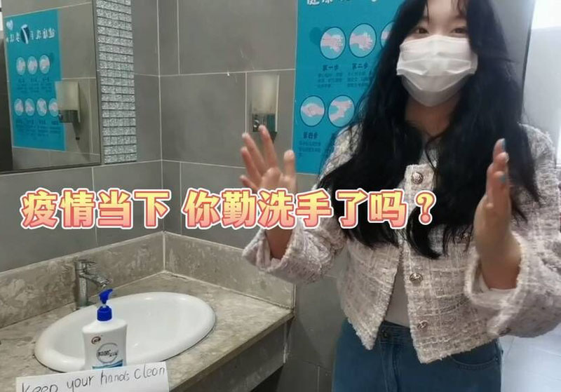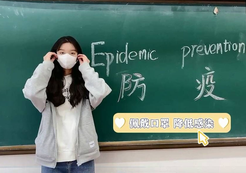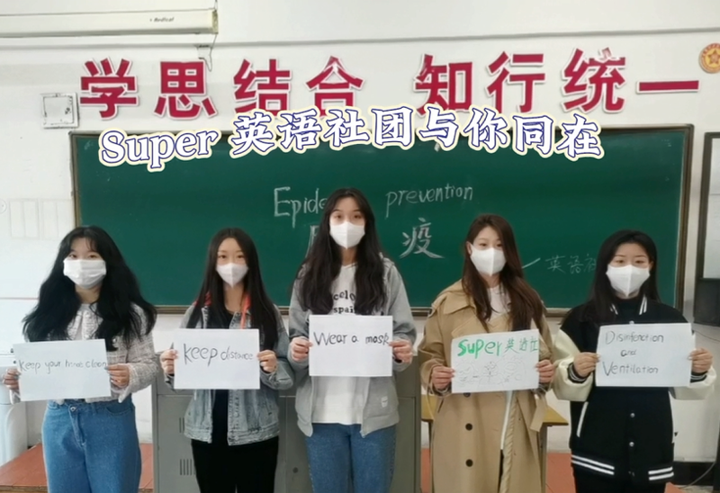 活动前一天,社团成员做了充分的准备。制作了五张卡片,一张画着护士穿着防护服与新冠病毒作斗争的图片,其余四张上面分别用英文写着KEEP YOUR HANDS CLEAN(保持手的卫生),WEAR A MASK (戴口罩),KEEP DISTANCE(保持距离),VENTILATION AND DISINFECTION(通风和消毒),并在会场黑板上醒目地写着本次活动主题“EPIDEMIC PREVENTION(防疫)”。晚7时,活动准时开始,在镜头中,同学们分组演示了七步正确洗手法,如何正确佩带口罩降低感染风险,如何正确通风和消毒,如何保持适当距离。录制视频每一个环节过程中,社员们一边演示一边用英语进行解说。在视频的尾声,同学们共同喊出口号——“待到疫情退去,便是春暖花开之时,加油!”。