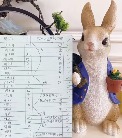 封校的第21天,原本是他答应女儿回家的日子。但晚上回到办公室想和10岁的女儿视频时,女儿已经睡着了。看见女儿发来的语音说:“爸爸,21天的时间卡片已经画完了,妈妈买的小兔子爸爸都到家了,你什么时候回来啊。我很想你”。面对着女儿的问题,他不知道该如何回答,因为他给不了孩子准确的答案。