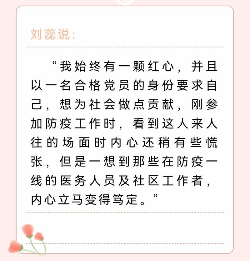 如她所说:“我始终有一颗红心,并且以一名合格党员的身份要求自己,想为社会做点贡献,刚参加防疫工作时,看到这人来人往的场面时内心还稍有些慌张,但是一想到那些在防疫一线的医务人员及社区工作者,内心立马变得笃定。”