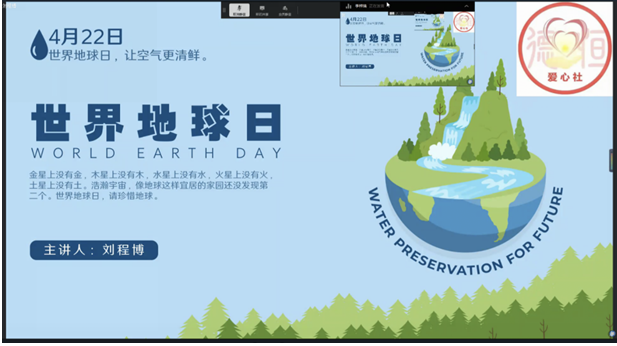 2022年4月22日是第53个世界地球日。今年的宣传主题是“珍爱地球 人与自然和谐共生”。值此之际,爱心社于2022年4月22日召开了以“保护环境 人人有责”为主题的线上会议,倡议同学们尊重自然、顺应自然、保护自然,积极践行习近平生态文明思想,加强环保意识,