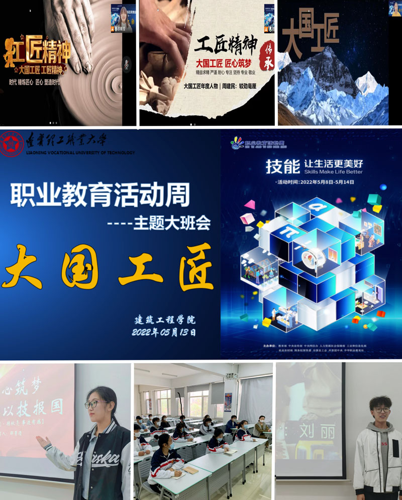 为向全校师生宣传职业教育“前途广阔、大有可为”,弘扬劳动光荣、技能宝贵的新风尚。5月13日下午15:00,建筑工程学院以“技能成就美好未来之大国工匠事迹”为主题,采用线上线下相结合的形式在各年级之间同步开展“职教周”主题活动。我院全体辅导员、全体在校班长及学习委员结合实践所学,立足“工匠精神”的定义,切入大国工匠的事迹,以生动案例讲述个人所感,以激情演说弘扬“大国工匠精神”,营造学生学习技能的良好氛围。