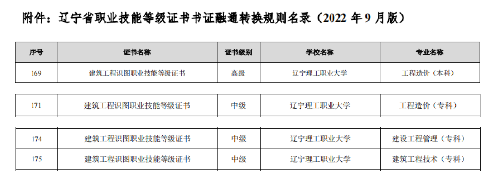 9月6日,辽宁省学分银行管理中心发布《辽宁省职业技能等级证书书证融通转换规则名录(2022年9月版)》,建筑学院四个专业获批建筑工程识图书证融通等级证书转换资格:工程造价(本科)-高级、工程造价(专科)-中级、建设工程管理(专科)-中级、建筑工程技术(专科)-中级。此次1+X建筑工程识图书证融通等级证书转换资格的成功获批,是对学院人才培养体系的充分肯定、体现了学院全方位、高标准的管理与要求。通过“1+X”职业技能等级证书知识和能力体系的构建,既保障了证书与课程学分顺利转换,也能促进学历证书与职业技能等级证书的互通衔接。
