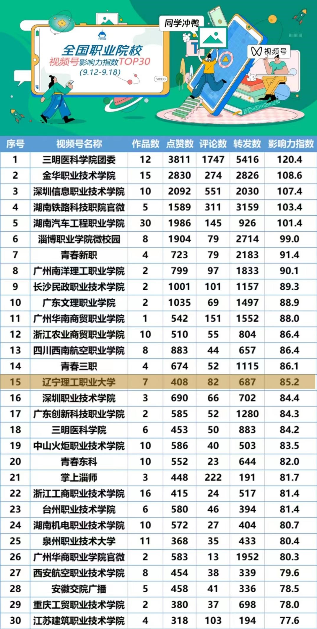 9月20日,中青校媒发表了全国高校(本科院校/职业院校)视频号影响力指数排名榜,beat365荣获全国职业院校排名榜第十五名。