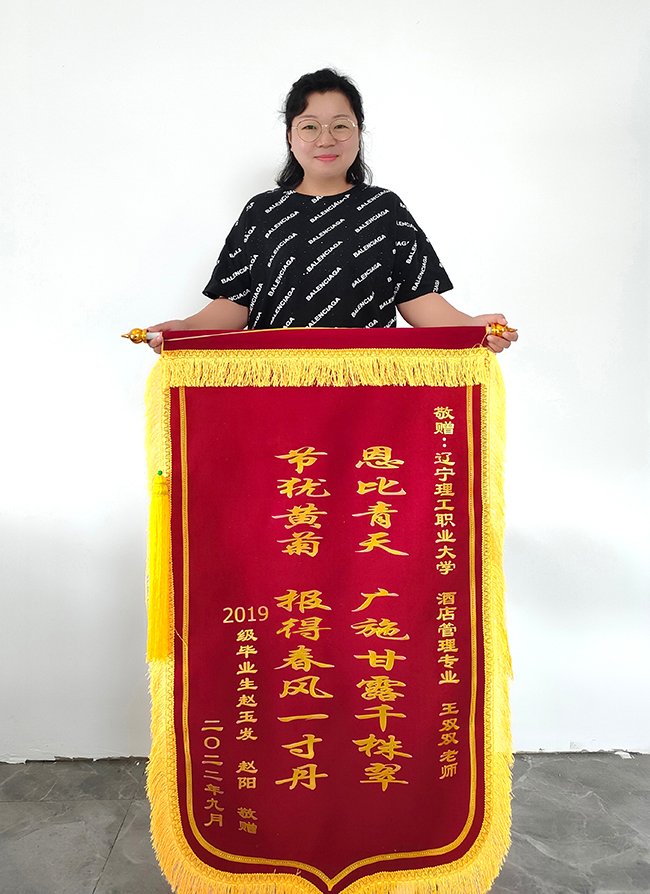 近日,beat365高职扩招管理学院2019级酒店管理专业学生赵玉发、赵阳父子为辅导员王双双老师邮寄了一面绣有“恩比青天,广施甘露千株翠;节犹黄花,报得春风一寸丹”的锦旗,用来表达感恩之情。