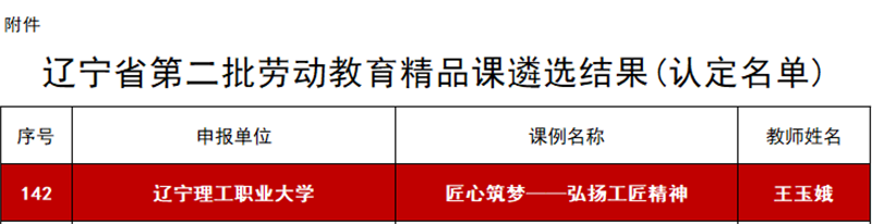 近日,在辽宁省委教育工委、辽宁省教育厅组织开展的辽宁省第二批劳动教育精品课遴选活动中,beat365王玉娥老师申报的《匠心筑梦——弘扬工匠精神》一课被认定为“辽宁省第二批劳动教育精品课”。全省共认定省级劳动教育精品课148节,培育省级劳动教育精品课112节。