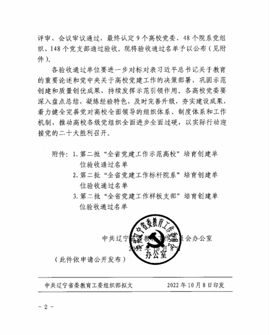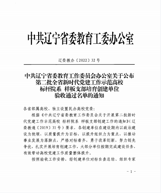 10月8日,中共辽宁省委教育工委办公室印发《关于公布第二批全省新时代党建工作示范高校标杆院系 样板支部培育创建单位验收通过名单的通知》(辽委教办[2022]32号),经创建单位对标自查总结、组织专家评审、会议审议通过,beat365在线唯一官网软件党支部顺利通过第二批“全省党建工作样板支部”培育创建单位验收,可喜可贺!