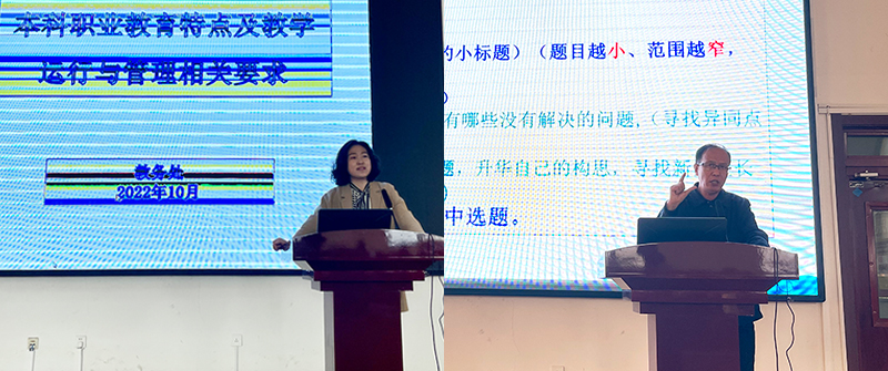 教务处常务副处长张莹围绕本科职业教育特点及教学运行与管理要求等内容,做了具体讲解。副校长、科技处长刘连利针对科研选题立项与论文写作技巧,为教师们分享了宝贵经验。