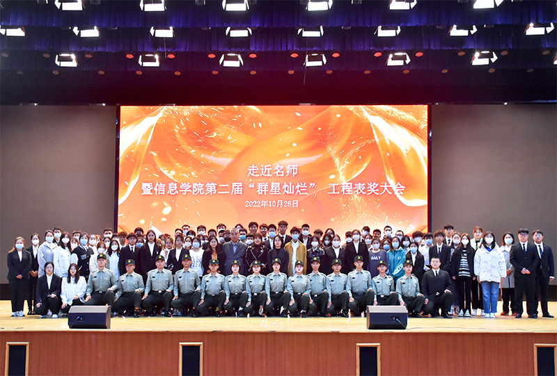 2022年10月26日下午1时,信息学院召开“走近名师暨信息学院第二届群星灿烂工程表奖”大会。全体教职工、获奖学生和2022级新生参加大会。走近名师,感悟思想引领,明确成长路径;表彰先进,树立身边榜样,弘扬奋发斗志。