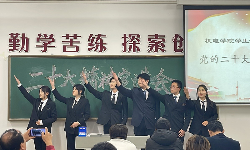为了迅速的宣传党的二十大精神,在二十大闭幕后,机电党支部便进行2022级学生演讲团员的选拔工作,组成了新生演讲团并为六个演讲团成员分配了各自的宣讲内容,让他们进行认真的准备,计划从10月31日开始到各班进行巡讲。由于疫情的原因,学校进行了两周的线下教育,宣讲活动搁置了两周。11月15日后,学生恢复了线上教学后,演讲团立刻进行备讲训练,于16日开始了首讲。本次宣讲采用了6名同学串讲的方式,按照《党的二十大号召我们这样团结奋斗》这个总题目,省略中间的报幕环节,宣讲员依次为同学们解读了党的二十大的筹备环节、大会的主题、中国式现代化、新时代的伟大成就、新征程党的中心任务、教育科技人才、法治、国家安全等方面的重大部署等方面的内容。最后以集体朗诵《这面旗是红色的》结束整场宣讲,宣讲团成员各个情绪饱满,脱稿宣讲,时间控制在二十分钟左右,致使宣讲过程同学们都听的十分认真,并由衷的为每位宣讲员报以热烈的掌声,宣讲计划还要给未上晚自习的大二同学及全体教师宣讲,促进机电学院掀起学习、宣传贯彻党的二十大精神的热潮。