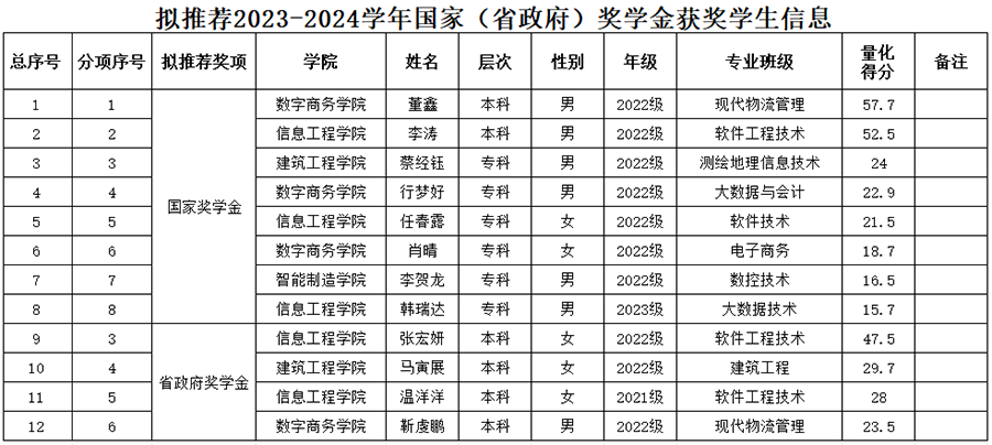 本年度国家(省政府)奖学金采取量化考核的方式,学生按照标准进行个人申报并量化赋分,由各班级或专业评议小组进行评议,再提交至学院学生资助工作领导小组审议,各学院学生资助工作领导小组按评审办法规定的申请条件,严格履行工作要求和程序,完成本学院认定和评审工作后,提交到学生处进行审核并对全校申报国家(省政府)奖学金的学生量化考核得分进行排名,按照省资助管理中心对获奖学生学历层次分配名额的要求,最终提出国家(省政府)奖学金拟获奖学生名单,由学校学生工作领导小组审议通过,现将拟获2023-2024学年国家(省政府)奖学金学生名单进行5个工作日公示,公示期为:10月8日-10月13日。