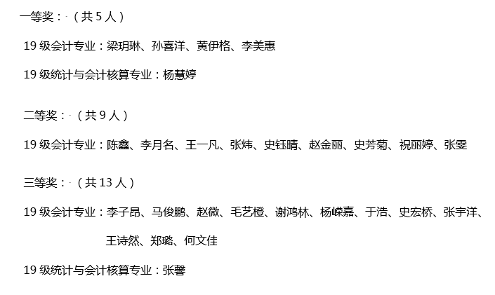 由学校主办、财贸学院承办的2021年大学生统计数据处理分析技能竞赛于2021年6月4日圆满结束。本次竞赛共有44人参加,经过严格考核,最终评出一等奖5人,二等奖9人,三等奖13人。现将获奖名单公布如下: