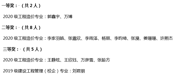 由建筑工程学院承办的2021年大学生建筑工程资料管理技能竞赛于2021年6月18日圆满结束。本次竞赛共有25人参加,经过严格考核,最终评出一等奖2人,二等奖8人,三等奖5人。现将获奖名单公布如下: