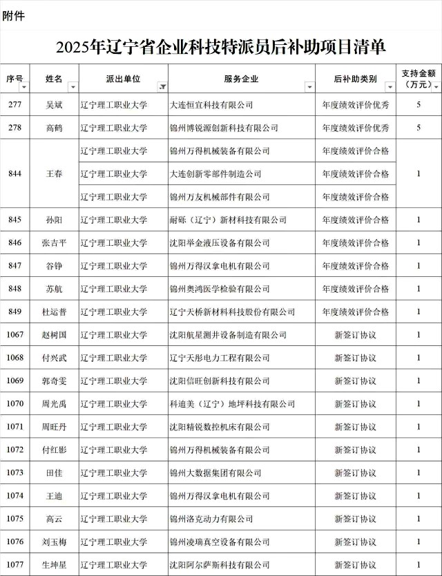 附件:2025年辽宁省企业科技特派员后补助项目清单