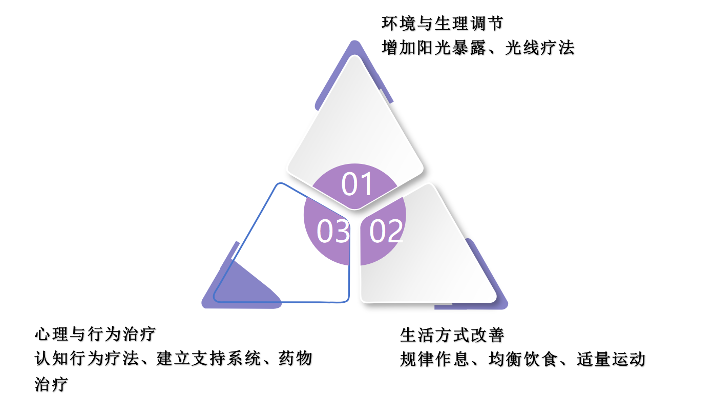 生活方式的改善和教育宣传是季节性情绪障碍预防和治疗的重要辅助手段。学校和家庭教育学生保持规律的作息时间,避免熬夜,保证充足睡眠;通过营养教育,引导学生选择均衡的饮食,减少高糖、高脂肪食品的摄入;提供多样化的体育活动,鼓励学生参与,以促进身体健康和情绪稳定。同时,通过校园广播、海报、讲座和工作坊等形式,提高师生对季节性情绪障碍的认识,教授自我识别和初级干预技巧,营造一个理解和支持患者的社会环境。这三位一体的干预策略综合作用于季节性情绪障碍的预防和治疗,旨在达到最佳干预效果。