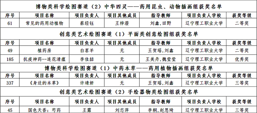 刘鑫、田野老师指导蔡经钰、王梓澄同学创作的《常见的药用动植物》在博物类科学绘图赛道(2)中华四灵——药用昆虫、动物插画赛项中获二等奖;王贺瑶、刘鑫老师指导白茗羊同学创作的《植药房》在创意类艺术绘图赛道(1)平面类创意绘图赛项中获二等奖;王贺瑶、刘鑫老师指导许靖妍同学创作的《身边的本草》在博物类科学绘图赛道(1)中药本草——药用植物插画赛项中获三等奖;李桐(信息学院)、赵思琪老师指导王露、徐芯萍同学创作的《国色天香:芍药》在创意类艺术绘图赛道(2)手绘器物类绘图赛项中获三等奖;王美丹、魏莹莹老师指导李佳喆同学创作的《抗疫神药--连花清瘟》在创意类艺术绘图赛道(1)平面类创意绘图赛项中获优秀奖。