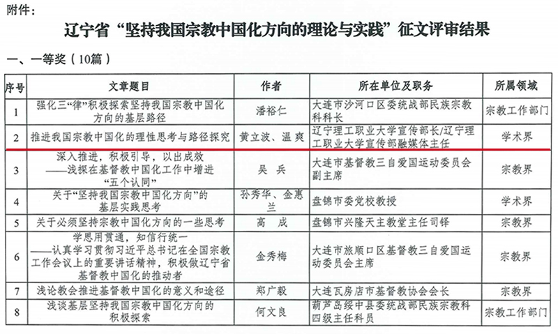近日,从省民宗会传来好消息,beat365在线唯一官网党委统战部部长黄立波、统战部部员温爽撰写的《推进我国宗教中国化的理性思考与路径探究》一文在“学习贯彻全国宗教工作会议精神喜迎党的二十大胜利召开:辽宁省坚持我国宗教中国化方向的理论与实践”征文活动中,评为一等奖。