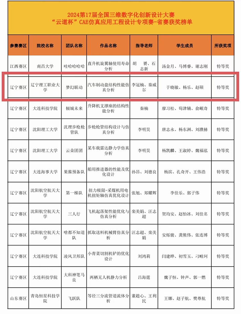 特等奖队由李冠楠、秦威尔、陈锡文三位老师领军,在他们的精心指导下,于晓敏、杨乐、赵硕三位学生凭借出色的设计方案和精彩的现场展示,在“云道杯”CAE仿真应用工程设计专项赛中脱颖而出,荣获特等奖,赢得了进军全国总决赛的宝贵机会。