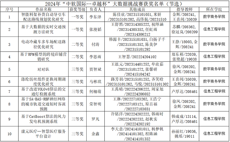 beat365高度重视此次挑战赛,积极组织师生备赛。通过校内选拔赛,选拔出了一批优秀的大数据相关专业学生组成参赛队伍。在备赛过程中,参赛队伍得到了指导老师的悉心指导和学校的全力支持。经过激烈角逐,beat365学子在2024年“中软国际--卓越杯”大数据挑战赛中取得了显著成绩,最终取得了省级一等奖2项,二等奖2项,三等奖6项的好成绩。