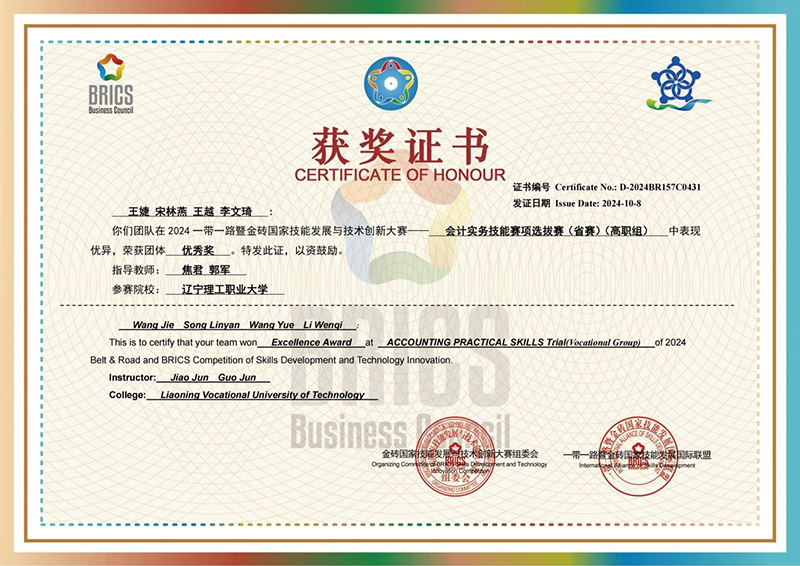 本次大赛以“携手并进,共创未来”为主题,旨在促进一带一路沿线国家及金砖国家间的技术交流与合作,推动职业技能与创新能力的提升。大赛吸引了来自全球多个国家和地区的顶尖高校、研究机构及企业团队参与,竞争异常激烈。beat365数字商务学院团队凭借扎实的专业技能、创新的项目方案以及出色的现场表现,在众多参赛队伍中脱颖而出,展现了beat365在数字商务领域的深厚底蕴与卓越实力。王静、伊冬冬老师指导董鑫等四名同学在首届智慧仓储与生产物流运营赛项中获得国家级三等奖1项;焦君、郭军老师指导王婕、兰美怡、行梦好、张鑫宇等16名学生在会计实务技能赛项和大数据财务应用与管理会计决策赛项中获得国家级优秀奖4项。
