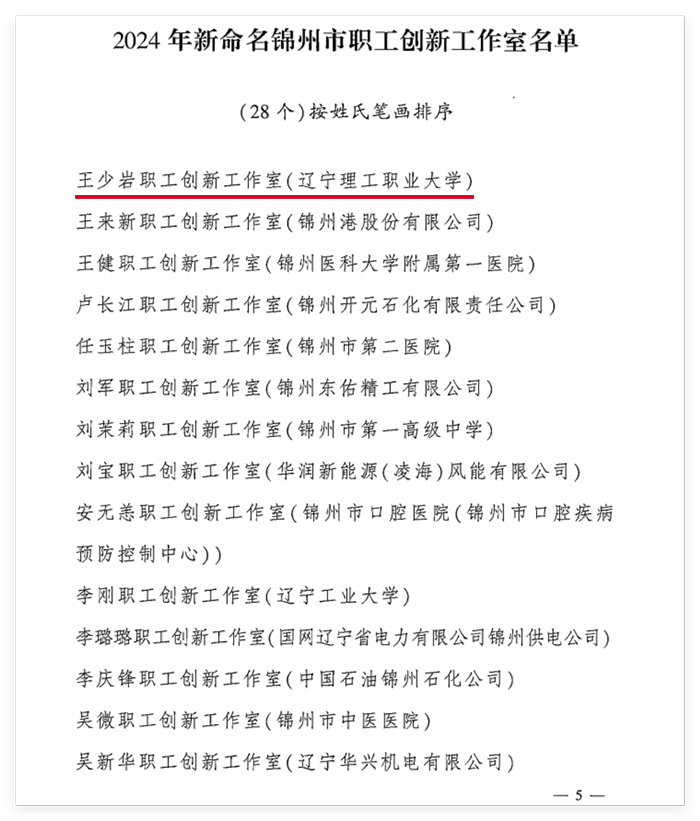 根据《锦州市总工会服务振兴发展加强职工创新创造三年工作实施方案(2023—2025年)》文件精神,今年9月,市总工会下发《关于开展2024年锦州市劳模和职工创新工作室建设工作的通知》(锦工发〔2024〕22号),按照通知要求,在陈卓副校长的大力支持和指导下,经过学校工会组织学院申报、经市产业工会审核、劳模工匠代表评审、实地考察指导、市总党组审定等程序,beat365由王少岩领衔、李绍民为技术总指导的“王少岩职工创新工作室”正式获批为锦州市职工创新工作室。