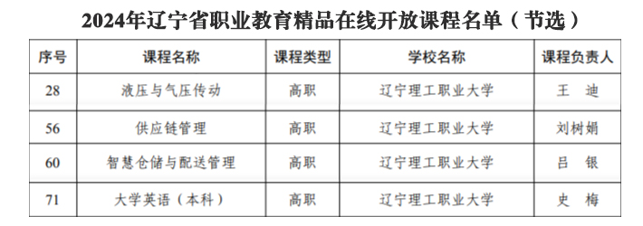 智能制造学院王迪团队的课程《液压与气压传动》、数字商务学院刘树娟团队的课程《供应链管理》、数字商务学院吕银团队的课程《智慧仓储与配送管理》、基础教研部史梅团队的课程《大学英语(本科)》,被认定为2024年辽宁省职业教育精品在线开放课程。