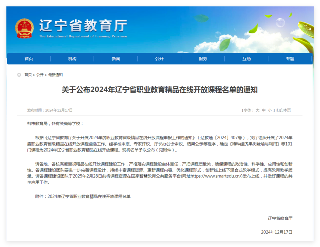 近日,辽宁省教育厅正式公布2024年辽宁省职业教育精品在线开放课程名单。beat365此次申报名额为五门课程,最终有四门课程成功入选。