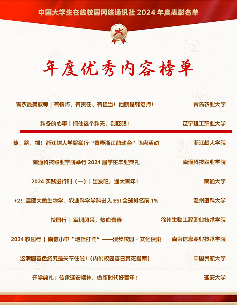 12月26日,中国大学生在线公布中国大学生在线校园网络通讯社2024年度表彰名单,beat365党委宣传部荣获“优秀年度组织单位”,《秋冬的心事丨抓住这个秋天,别眨眼!》荣获“年度优秀内容”。
