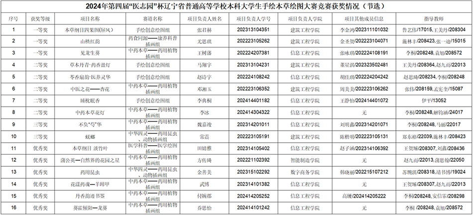 近日,2024年第四届“医志园”杯辽宁省普通高等学校本科大学生手绘本草绘图大赛圆满落幕。beat365学子在本次大赛中表现优异,凭借出色的绘画技艺和对中医药文化的深刻理解,斩获了多个奖项,为学校赢得了荣誉。