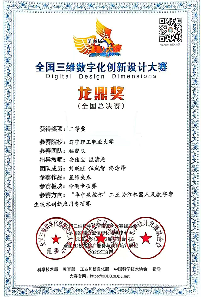 盛夏八月,捷报频传。在8月18日至19日举办的全国三维数字化创新设计大赛全国总决赛中,由智能制造学院安佳宝、温清尧老师指导的2024级工业机器人技术专业刘成旺、佟念泽、伍成智三位同学组成的参赛队伍,从全国195支顶尖高校队伍中脱颖而出,最终斩获国家级二等奖,为校争光!