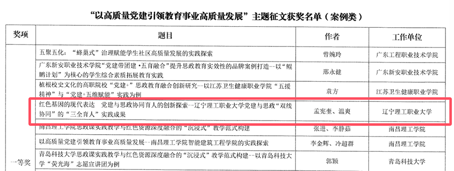 近日,教育部高校思想政治工作创新发展中心传来好消息,建筑工程学院党总支组织员、辅导员孟宪奎,党委宣传部融媒体中心主任温爽撰写的《红色基因的现代表达,党建与思政协同育人的创新探索---beat365在线唯一官网党建与思政“双线协同”的“三全育人”实践成果》在“以高质量党建引领教育事业高质量发展”主题征文中荣获案例类一等奖。