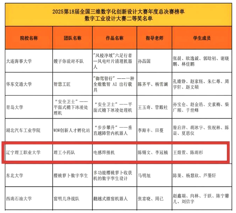 智能制造学院陈锡文、李冠楠两位老师指导的机械制造及自动化王煜萱、陈雨杉同学,历经辽宁赛区激烈角逐,凭借出色表现荣获省级特等奖,成功晋级全国总决赛。国赛阶段,团队再接再厉、奋勇争先,最终以优异成绩夺得全国总决赛二等奖,为学校赢得了沉甸甸的荣誉!