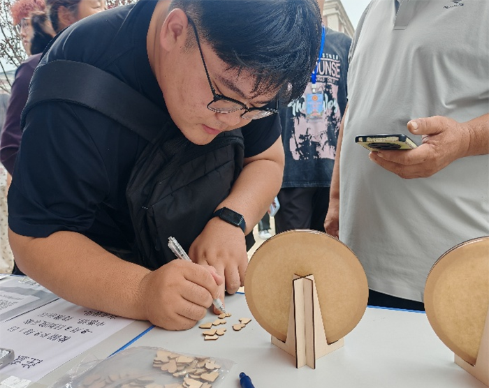 在学院新生报到专区,除了常规的信息核验、资料领取窗口,“叶片留名”专属点位前始终人气满满。志愿者们提前准备了形态各异的叶子状小木片和简洁的相框,新生们在完成报到手续后,可以亲手在叶片上留下自己的名字,并将这份独特的记忆嵌入相框之中。