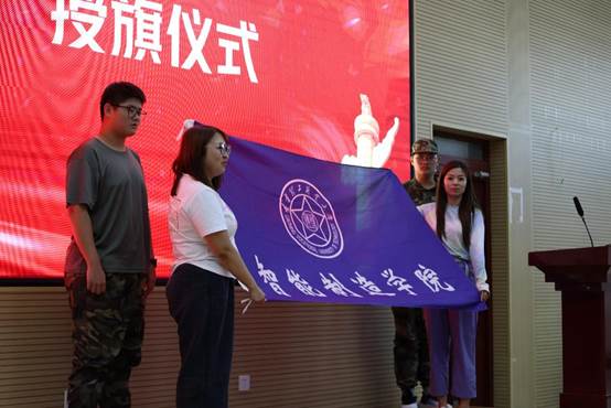 刘嘉媛副院长与辅导员杨丹妮为新生代表授予学院旗帜,旗帜不仅是荣誉的象征,更是团队团结协作的标志。