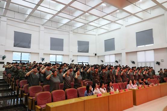 随后,全体新生起立,在朱浩楠同学的带领下右手握拳、庄严宣誓:“21天,严守纪律,服从指令;21天,刻苦训练,锤炼意志……智能制造,青春无悔!21天成长,我们必胜!”铿锵有力的誓言回荡全场,是新生们对自己的承诺,更是勇往直前的决心。