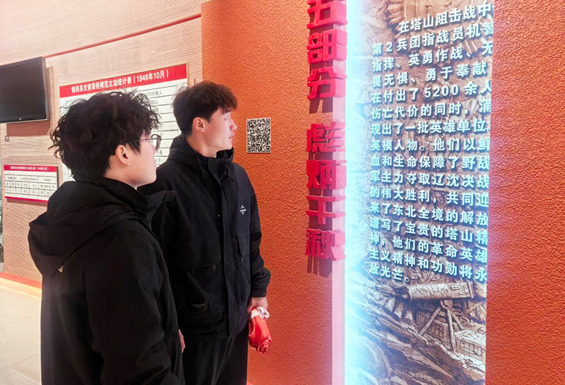 走进纪念馆,仿佛推开了一扇通往历史的门。赵九而书记、马丽老师站在一幅幅老照片、一件件旧文物前,放慢脚步、压低声音,为师生们详细讲述塔山阻击战的峥嵘过往——那些没有高山依托、全凭血肉之躯筑起“长城”的日夜,那些“人在阵地在”的誓言,那些为了胜利义无反顾的身影……讲解中,既有对历史细节的精准还原,更有教师对坚守与担当的深切感悟;同学们屏息聆听,时而驻足凝视展柜里的旧水壶、泛黄的战地书信,时而沉思,眼中满是崇敬与动容。大家知道,这些刻着岁月痕迹的物件,不仅是历史的见证,更是今天最珍贵的精神教材。