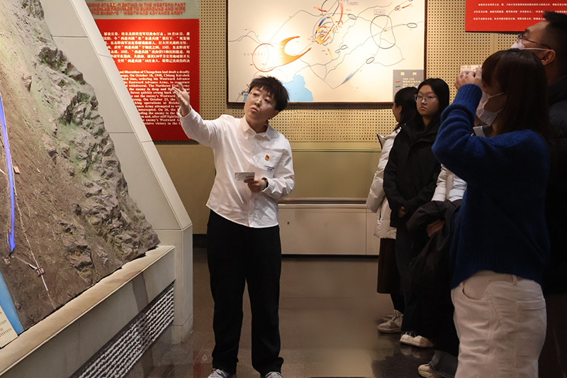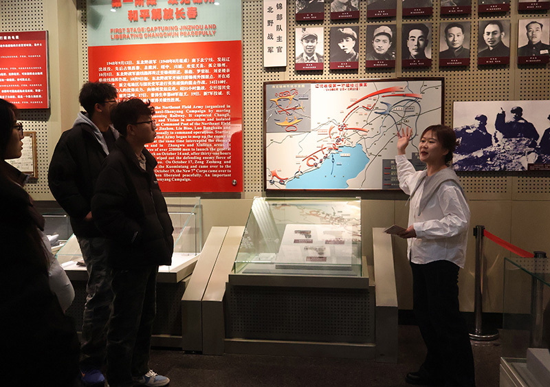 在战史馆,王盈心、鲍野、王双、周琪琪、金凤姣5位教师分别围绕“抗战胜利后的形势与中国共产党的方针”“夏、秋、冬三季攻势对东北解放的战略奠基作用”“配水池战斗”“塔山阻击战”和“黑山阻击战”核心内容展开专题讲解。他们通过翔实的史料与生动的叙述,再现了中国共产党在抗战胜利后准确研判国内外局势、坚定推行“向北发展,向南防御”战略方针的历史智慧,以及东北人民解放军将士在战役中英勇顽强、浴血奋战、不怕牺牲的英雄气概,充分彰显了中国共产党领导人民军队克敌制胜的历史逻辑与精神力量。