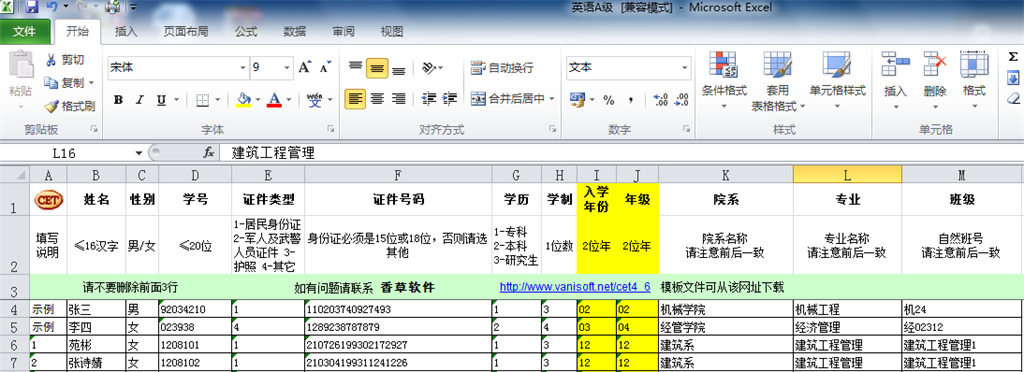 1 每个分院下发三个表格模板,请分别填入A级、四级、六级报名人员信息。此模板只供填写,不得删除、修改原有各项信息、格式。表格中的示例请不要删除。