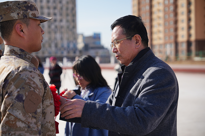 家长代表与学生一一话别。学生面对依依不舍的家长代表行了庄严的军礼。学校领导和老师给学生佩戴红花并向学生赠送了慰问品。应征学生纷纷表示一定不会辜负母校的嘱托,在即将到来的军旅生活中锐意进取,不负青春,不留遗憾,争做新时代革命军人!