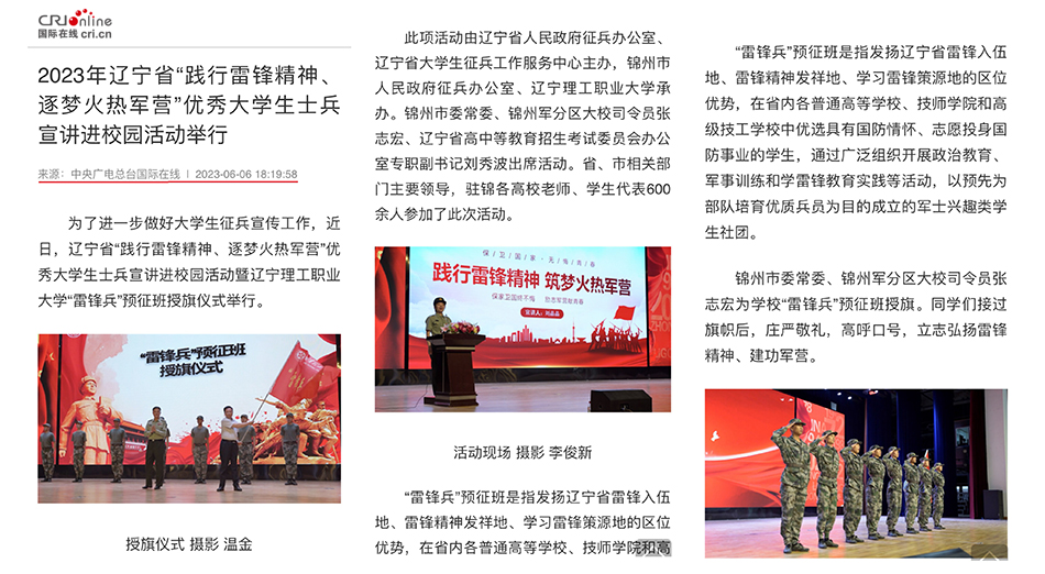 beat365承办的“2023年辽宁省‘践行雷锋精神,逐梦火热军营’”优秀大学生士兵宣讲进校园活动暨beat365在线唯一官网“雷锋兵”预征班授旗仪式在中央广电总台国际在线宣传报道。
