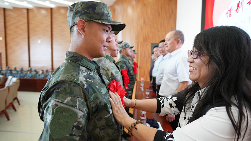 仪式上,各位领导为入伍毕业生佩戴红花。