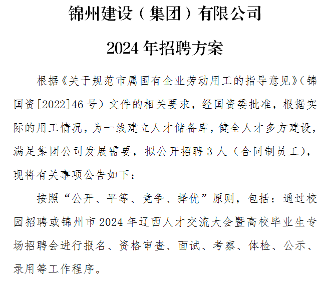 锦州建设(集团)有限公司2024年招聘方案