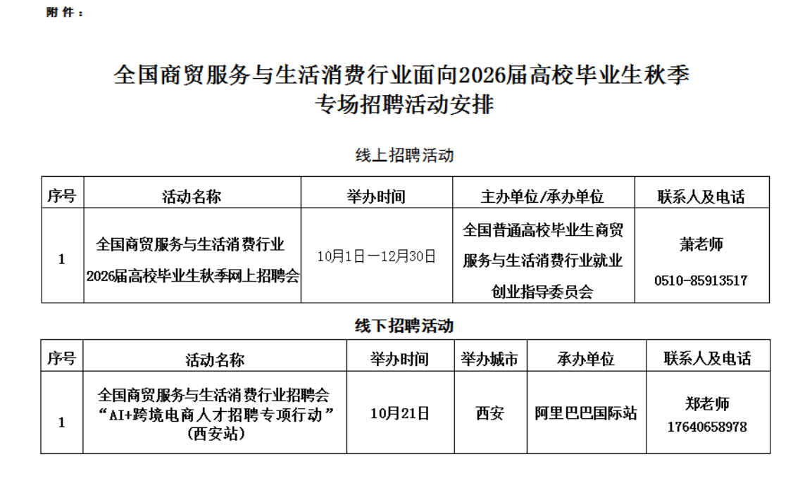 (一)举办线上专场招聘活动。即日起至12月30日,在国家大学生就业服务平台(https://www.ncss.cn)举办全国商贸服务与生活消费行业2026届高校毕业生秋季网上招聘会,集中发布全国商贸服务与生活消费行业用人单位招聘信息,促进高校毕业生与用人单位供需精准对接。