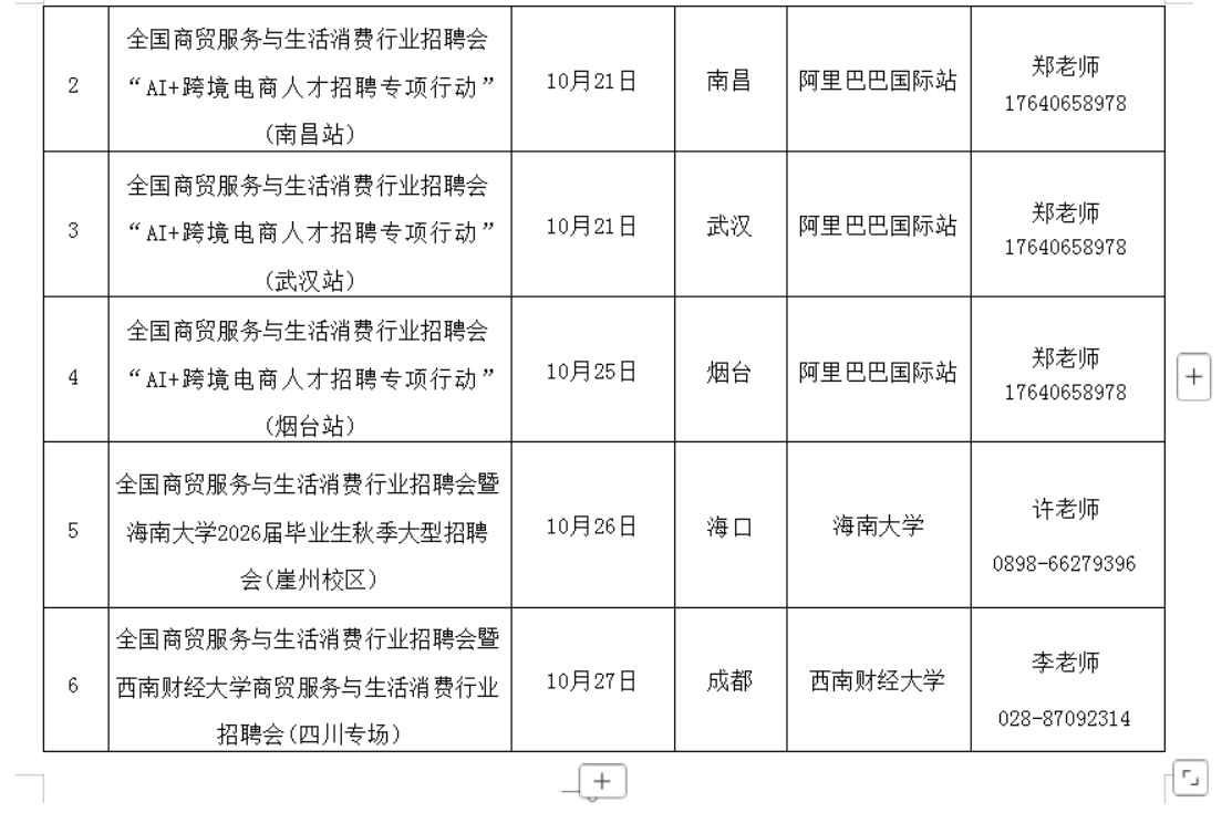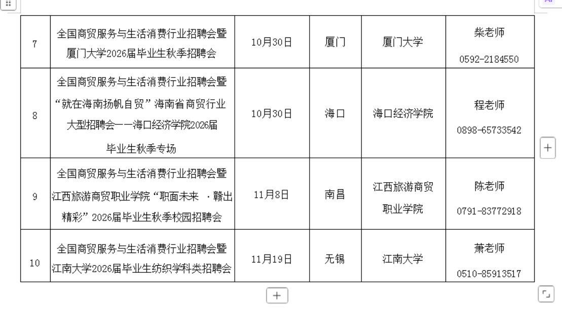 (二)举办线下招聘活动。10月21日至11月19日,在厦门、成都、无锡、海口、南昌等城市举办商贸服务与生活消费行业系列专场招聘活动,汇集商贸服务与生活消费行业用人单位优质岗位资源,助力行业人才和企业精准对接。